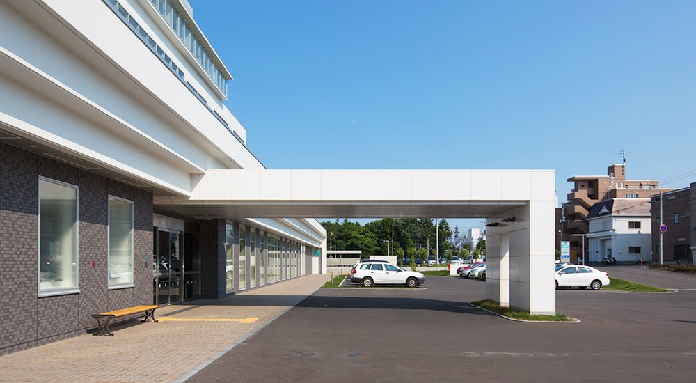 隣接するスーパーマーケットの建物ラインに合わせて後退させることで周辺の街並みとの調和を図りました。