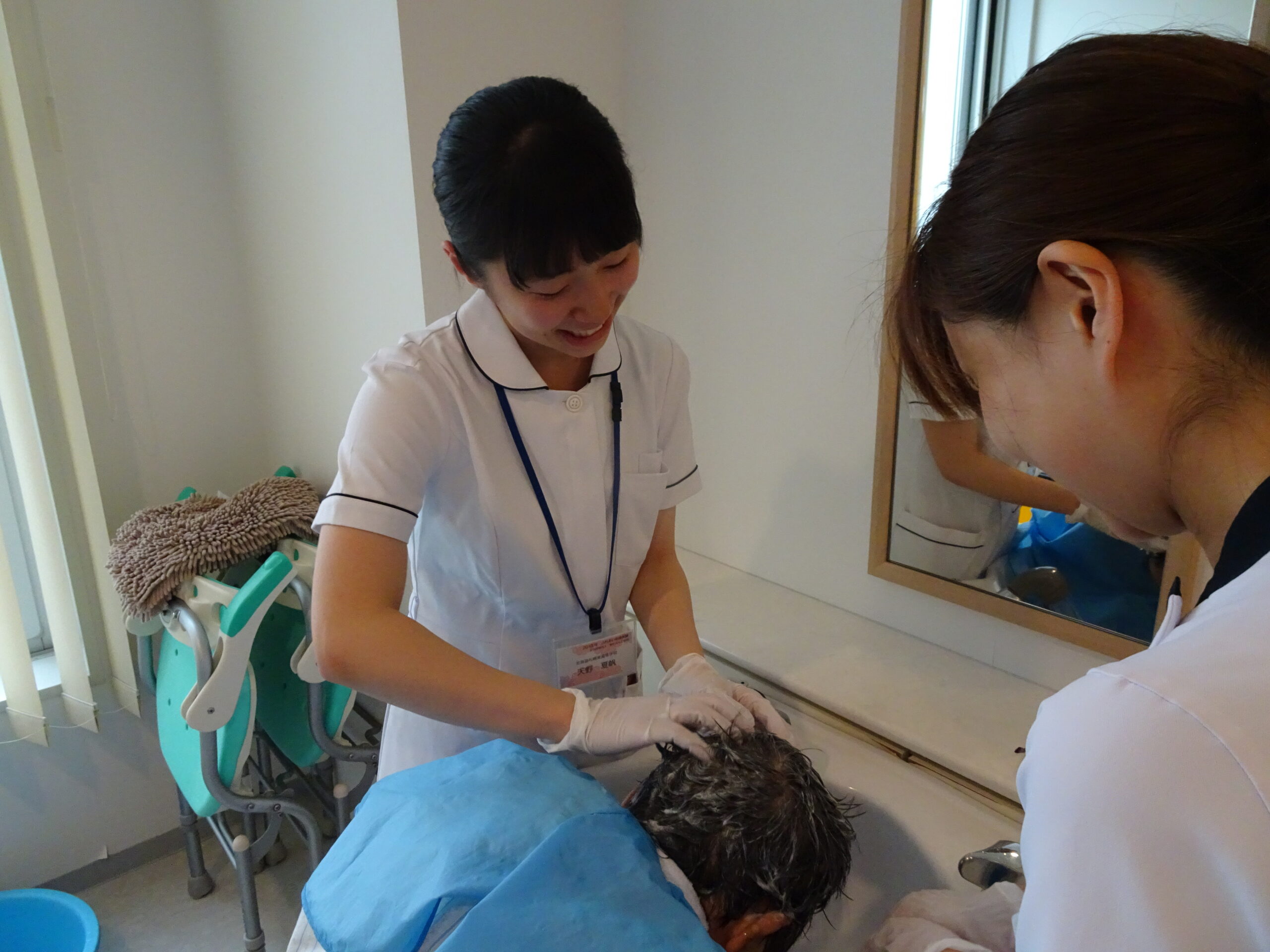 看護師の洗髪を見学し、実際に患者さんのケアを体験しました。