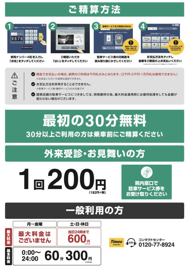2025年10月1日より病院駐車場運営・管理をタイムズ24株式会社が執り行うことになりました。当院駐車場のご利用の皆様にはご理解ご協力のほどよろしくお願い申し上げます。なお駐車場利用に関するお問い合わせは、下記のタイムス24株式会社コンタクトセンターまでお願い申し上げます。