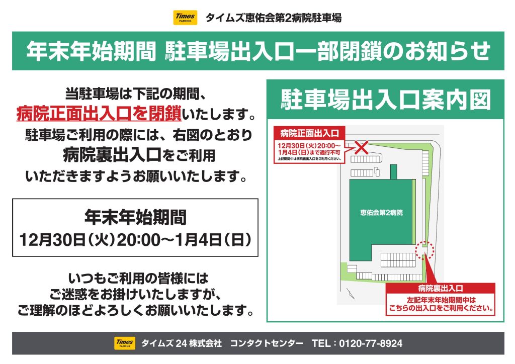 年末年始外来休診に際し、下記のとおり病院正面側の出入口を封鎖いたします。駐車場ご利用の方はタイムズ駐車場精算機のある「病院裏側出入口」をご利用ください。ご来院される利用者様にはご不便ご迷惑をおかしますが、ご理解ご協力のほどよろしくお願い申し上げます。なお駐車場に関するお問い合わせは、タイムズ駐車場コンタクトセンター(0120-77-8924)までお願い申し上げます。
