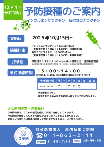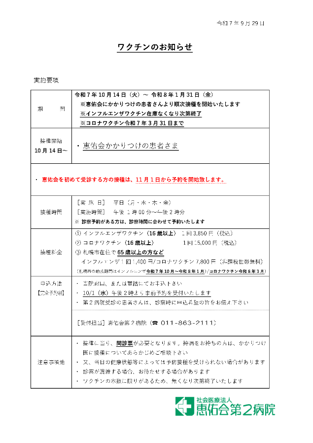 令和7年10月1日よりインフルエンザワクチン・コロナワクチンの予約を