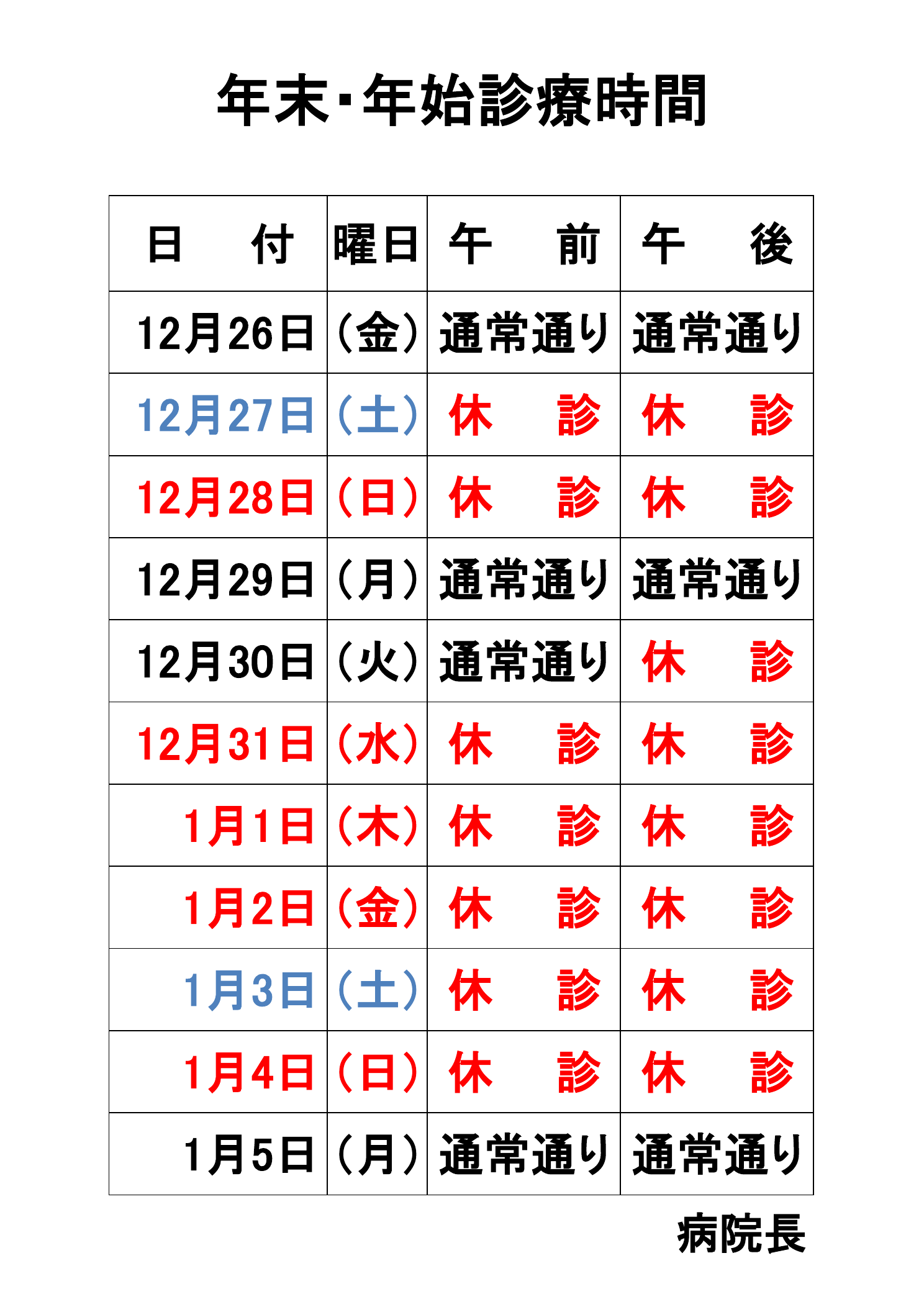 令和7年12月30日(火)午後~令和8年1月4日(日)まで 休診となります。